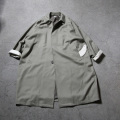 シルエットはインナーにニットやスウェット、若しくはラペルジャケット等の厚みのあるモノをレイヤードしてもバランスよく着用できるリラックスシルエット。 フロントの前立ては比翼でスッキリみえる仕様。サイドにハンドウォーマーポケットのみで、襟にはあると便利でアレンジも可能なチンストラップを配置。 後ろから見るとラグランスリーブ、前から見るとセットインスリーブの面白い仕上げ。チンストラップの裏地や袖裏にはチラッと見えた時にアクセントになるシルクを仕様。裏地も着用感を考慮したコットン×レーヨン素材を使用。このアイテムへのデザイナーの自信の表れが垣間見えます。