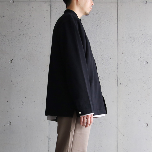 スウェットより細い綿糸を強く撚った爽快感のあるドライタッチの風合いが使い勝手抜群の襟付きのニットカーディガン。袖や前立てのボタン使いはシャツと同様の仕上げですので、暑さの残る時期はライトアウター感覚の羽織りとしても使え、寒い時期はシャツ感覚のインナーとしても着用頂けます。