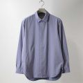 ポリエステルとコットンをブレンドして編み立てた天竺素材を用いたシンプルなシャツ。ハイゲージかつプレーティングで編み立てているため、薄さの割には透けにくく、適度なハリ感があり、表面には特殊加工を施し毛羽を抑え、ナチュラルな光沢感のある滑らかな風合いに仕上げています。シルエットは適度なゆとりを持たせながらもスッキリとしたコンパクト仕様。数シーズン定番型として継続していますが、今シーズンはボタンを隠して比翼にすることで、ミニマルに仕上げることにより、シャツジャケット感覚としても着用できます。第一ボタンを外してもだらしなく見えないよう第二ボタンを高めに設定。開きの無い独自の筒袖カフス仕様。裾は折り返しではなく裏バインダー仕様にする事で、美しいラウンドの形を実現しています。バックヨークにはカットソー素材では難しいギャザーを施し、クラシックな印象を加えています。 ボタンはスナップボタンの仕様ですので、脱着も楽でスッキリ見える所が良いですね。昨今のゆったりとしたシルエットのトレンドも相まって、カップルやご夫婦で兼用も可能です。